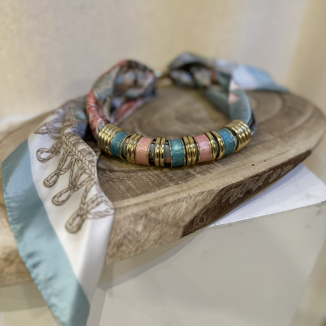 Collar de bisutería con pañuelo efecto seda. Se abrocha por detrás con el pañuelo con un nudo corredero